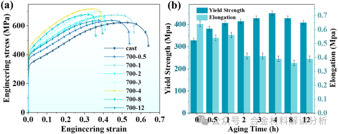 图6: Co29Cr31Cu4Mn15Ni21高熵合金在700 °C时效不同时间的力学性能:(a)拉伸工程应力-应变曲线;(b)屈服强度和延伸率。