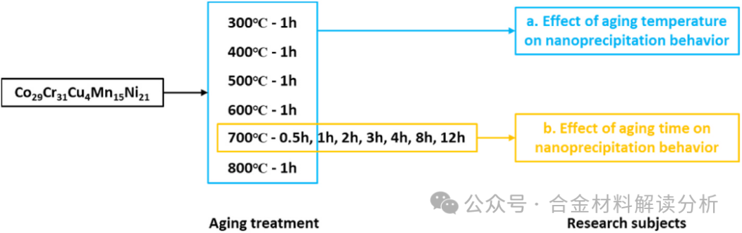 本研究系统考察了时效热处理对Co29Cr31Cu4Mn15Ni21纳米强化高熵合金微观结构和力学性能的影响。采用了300–800 °C的热处理温度和0.5–12 h的时效时间。主要研究结果如下: