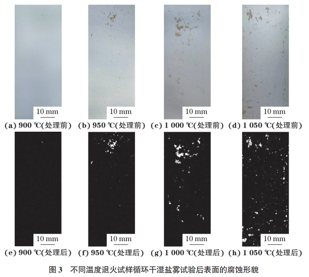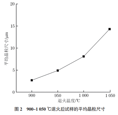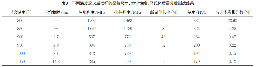 304 奥氏体不锈钢具有优秀的耐腐蚀性能、可焊接性能和加工性能等,广泛应用于化工、家电、汽车和船舶等制造领域。奥氏体不锈钢冷轧后的常规退火工艺为1040℃以上保温后快冷。常规退火后奥氏体冷轧不锈钢的屈服强度较低,室温屈服强度通常为230~300MPa,这限制了其在结构材料上的使用。可以采用冷作硬化方式提高不锈钢的屈服强度,但是会降低材料的成型性能,且奥氏体加工硬化产生的马氏体会使材料的相对磁导率增大;也可以通过添加Ti、Nb、V等微合金化元素控制奥氏体不锈钢晶粒细化和碳氮化物沉淀强化,以提高材料的强度,但是微合金化对热处理工艺有严格的要求,且添加合金元素会带来冶炼成本的增大。根据霍尔佩奇公式,晶粒细化可以提高材料的屈服强度,晶粒在退火时的长大速率与退火温度的关系较大,在再结晶温度以上,退火温度越高,晶界迁移速率越快,晶粒的长大速率也就越快,因此理论上可以采用降低退火温度的方法细化不锈钢晶粒、提高材料的屈服强度,且与上述冷作硬化和微合金化方法相比,该方法成本更低,是一种提升材料强度更为经济的方法。 研究人员以最常规的304不锈钢为研究对象,结合工厂连续退火设备的实际情况,制定了试验参数,研究了退火温度对不锈钢晶粒度、屈服强度和断后伸长率的影响,还研究了其对耐腐蚀、折弯等性能的影响,以为产品高强度化、减薄化或轻量化提供理论基础。 1 试样制备与试验方法 初始试样为6个经过76%大压下率冷压延加工的304不锈钢硬态材卷料,硬态材厚度为0.7mm,来源于同一炼钢炉号。试验材料的化学成分和退火前的力学性能、马氏体质量分数分别如表1,2所示。 利用工厂连续退火炉进行退火,退火线速率为60m/min,结合退火炉的长度,计算得到退火在炉时间为1.5min;退火炉温度分别设为850,900,950,1000,1050 ℃,炉温稳定后通入测试卷,测试卷在热处理后出炉水冷,再经过中性盐电解、含有硝酸和氢氟酸的混酸酸洗去除表面氧化皮,得到表面光洁的不锈钢板。 取上述退火酸洗后的试样,将试样机械切割、热镶、磨抛至镜面后,使用10%(体积分数)硝酸水溶液电解腐蚀,腐蚀后经乙醇溶液清洗、冷风吹干,在光学显微镜下观察显微组织,参照GB/T 6394—2017《金属平均晶粒度测定方法》中的截点法测定晶粒平均尺寸。依据GB/T 228.1—2021《金属材料 拉伸试验 第1部分:室温试验方法》,使用万能试验机对试样进行室温拉伸试验。按照GB/T 4340.1—2009《金属材料 维氏硬度试验 第1 部分:试验方法》对试样进行硬度测试,载荷为49N。使用铁量测定仪测试退火前后形变马氏体的含量,马氏体的含量以铁量测定仪测定值乘以1.7计算。参照GB/T 232—2024《金属材料 弯曲试验方法》,将试样垂直于原板压延方向无垫模折弯180°,试样弯折后,在光学显微镜下观察折弯面的开裂情况和粗糙度。参照GB/T 20854—2008《金属和合金的腐蚀循环暴露在盐雾、“干”和“湿”条件下的加速试验》,将试样循环暴露于中性盐雾、“干”和“湿”试验环境下进行循环盐雾试验(CCT),盐溶液为50g/L氯化钠溶液,试验周期为30个循环,每个循环8h(盐雾2h,“干”4h,“湿”2h),试验完成后对试样表面扫描拍摄,并使用ImageJ软件对试样表面腐蚀的面积占比进行统计。 2 试验结果 2.1 不同温度退火后的显微组织 图1为试样经800~1050℃退火后的显微组织形貌。由图1可知:800℃退火后显微组织由灰色形变马氏体和白色条带状奥氏体组成,此外在马氏体上有少量的白色颗粒状组织,推断其为形变马氏体逆转变而成的奥氏体晶粒;850℃退火后显微组织中等轴状奥氏体晶粒明显增多,尺寸极细小,约为1μm,组织中仍存在少量条带状奥氏体;900~1050℃退火后显微组织中形变马氏体基本消失,条带状奥氏体也全部完成再结晶转变,组织由等轴状奥氏体晶粒组成,且随着退火温度的升高,晶粒尺寸逐渐增大。 图2为利用截点法测得的900~1050℃退火后试样的平均晶粒尺寸。由图2可知:900,950℃退火时,平均晶粒尺寸不大于5μm;1050℃退火时,晶粒尺寸增大至14μm,与常规冷轧退火态304不锈钢的晶粒尺寸相当。 2.2 不同温度退火后的力学性能 不同温度退火后试样的晶粒尺寸、力学性能、马氏体质量分数测试结果如表3 所示。由表3可知:试样的屈服强度、抗拉强度与马氏体质量分数都随着退火温度的升高而降低,在800~900℃时,试样的力学性能下降较快,在900 ℃退火时,马氏体质量分数小于0.5%,在900℃退火1.5min时,马氏体基本完成向奥氏体的转变,平均晶粒尺寸为2.7μm,屈服强度不低于500MPa,比常规退火材料提高了1倍,同时断后伸长率不小于40%,能够满足绝大多数加工成型场合的应用;950,1000℃退火时,试样的屈服强度和抗拉强度逐渐降低,但是仍比常规退火状态下304不锈钢的强度高约20%~40%,1050℃为不锈钢的常规退火温度,在1050℃退火1.5min,材料的各项力学性能都与常规冷轧退火态304不锈钢的力学性能相当。 2.3 不同温度退火后的耐盐雾腐蚀性能 图3为不同温度退火试样循环干湿盐雾试验后表面的腐蚀形貌。由图3可知:900℃退火后试样表面基本没有生锈,随着退火温度的升高,试样表面的锈点逐渐变多,利用ImageJ软件对图3(a)~3(d)进行处理并计算锈点面积所占的比例,处理后可见正常未锈蚀部位为黑色,锈点部位为白色,统计得锈点面积占比分别为0,0.73%,1.89%,2.44%。 试样表面耐腐蚀性能存在差异的原因与晶粒尺寸