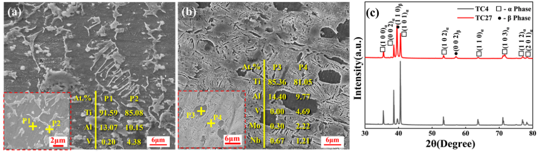 图1 (a)TC4和(b)TC27的显微组织; (c)两种合金的XRD图谱。随着Mo和Nb的加入,TC27中β相的含量显著提高,同时β相主要以耐蚀的(1 1 0)晶面为暴露面,表明TC27基体较好的耐蚀性。