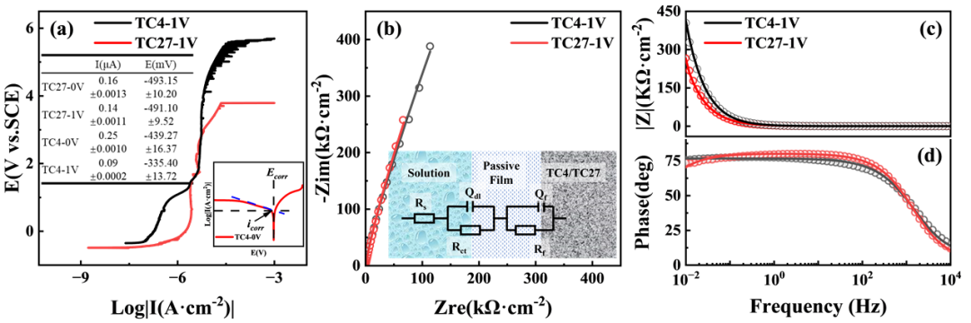 图4 在1V vs SCE极化后TC4和TC27的(a)极化曲线; (b)Nyquist图; (c)Bode图。其中TC4更低的腐蚀电流密度和更大的极化电阻(Rp=4.77×106)都表明其在极化后强于TC27。表明二者耐蚀性在极化后出现了“反转”现象。
