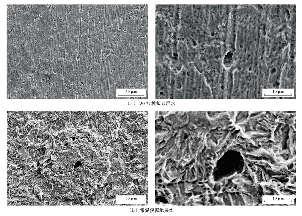 图5 油管钢在-20℃模拟地层水溶液和常温模拟地层水溶液浸泡14 d除锈后的表面形貌