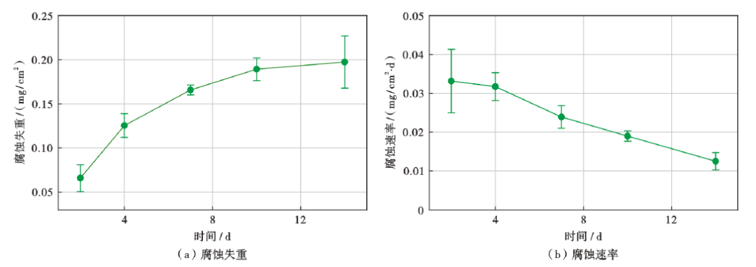 C—单位面积腐蚀失重,mg/cm2;v—腐蚀速率,mg/(cm2·d);t—腐蚀时间,d;wi—除锈后试样的质量,g;w0—试样的原始质量,g;S—试样的表面积,cm2;d—点蚀坑直径,μm;D—点蚀坑深度,μm。