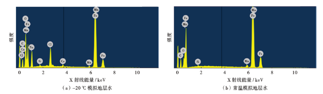 Fig.6 EDS analysis of corrosion products on tubing steel of immersion in simulated formation water at -20℃ and room temperature after 14days