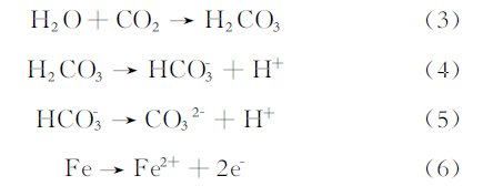 由油管钢浸泡后锈层成分的EDS分析(图6)可以看出,C、O元素含量较高,当油管钢暴露于CO2环境中并发生腐蚀时,所生成的腐蚀产物膜主要由FeCO3构成。这一产物的形成涉及的机理有多种解释,较为认可的主要有以下化学反应过程:
