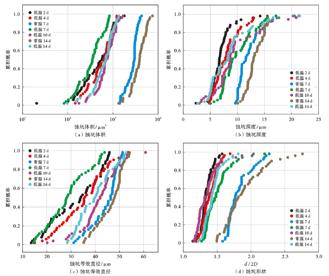 为了对比试样表面总体的腐蚀情况,量化点蚀坑的形貌特征,利用CLSM测量试样表面点蚀坑的形貌数据,每个条件下统计50个点蚀坑进行计算,得到点蚀坑的深度、直径、体积和形状的累积概率分布以及区间分布如图8所示。结果表明,油管钢在常温和低温下的腐蚀区别非常明显,相较于低温腐蚀,油管钢在常温下的蚀坑体积、深度、等效直径、d/2D以及蚀坑深度的分布区间统计均显著地大于低温。由此可见,在低温浸泡时,油管钢的腐蚀更倾向于纵向扩展长大,而常温浸泡下横向方向生长的趋势更大。