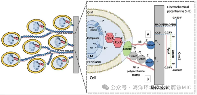 王等指出,SRB细胞外膜上的c型细胞色素等电子穿梭蛋白,使细胞可直接利用胞外不溶性碳钢中的电子,并将其穿过细胞壁传递至胞内,引发碳钢腐蚀。