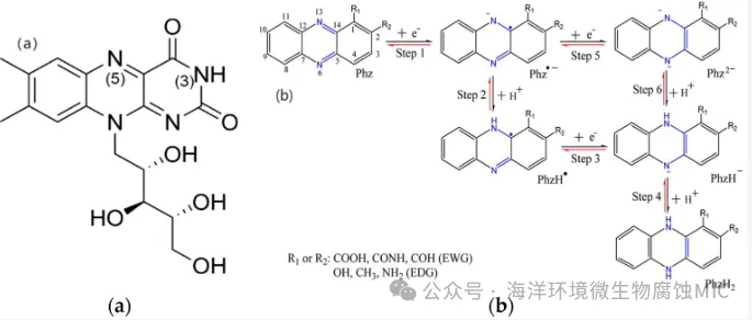 核黄素在氧化还原过程中可存在三种形式:氧化态核黄素(Flₒₓ)、自由基态核黄素(Flᵣₐd·⁻)、还原态核黄素(Flᵣₑd²⁻)。由于Flᵣₐd·⁻与Flᵣₑd²⁻的中点电位仅相差0.06 V,适合作为胞外电子载体,与细胞色素或金属发生单电子或双电子反应。