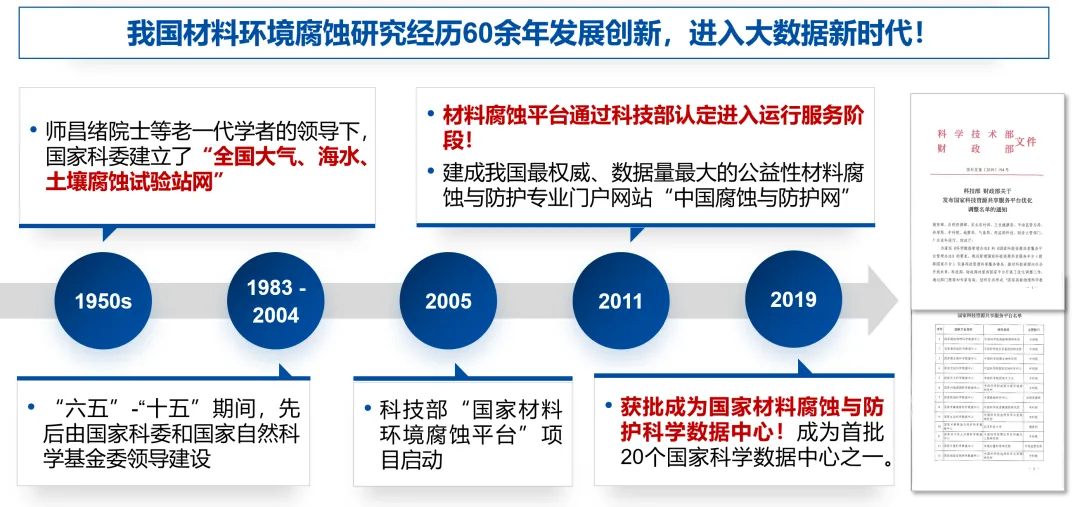 我国的材料自然环境腐蚀试验及数据积累工作始于上世纪50年代末,60年来,腐蚀网站工作经历了国家科委腐蚀学科组、文革中断、恢复建设、国家自然基金会全国腐蚀网站建设、科技部科技基础条件平台建设、科技部科技资源共享平台建设运行等阶段,包括师昌绪院士、侯祥麟院士等一批知名学者对腐蚀网站工作给与了长期的大力支持。北京科技大学腐蚀与防护中心作为牵头建设单位,在腐蚀网站建设过程发挥了重要作用,王光雍教授在异常艰苦的条件下,领导了腐蚀网站二十多年的发展并形成体系。近二十年来,腐蚀网站在李晓刚教授的领导下,建设了我国新时期规范化的材料环境腐蚀野外试验站网与评价技术体系,建成了大型数据库和国家级共享服务平台,为新装备新材料研发奠定了坚实的基础,解决了若干国家重大工程的材料腐蚀难题。基于腐蚀网站多年的腐蚀试验及数据积累研究基础,由李晓刚教授主持建设的“国家材料环境腐蚀野外科学观测研究平台”于2011年被科技部和财政部认定为首批国家科技基础条件平台。“十二五”和“十三五”期间,按照“整合、共享、服务、创新”的建设方针,开放共享平台的资源,持续为社会各界提供科技支撑服务,取得了显着的成效。