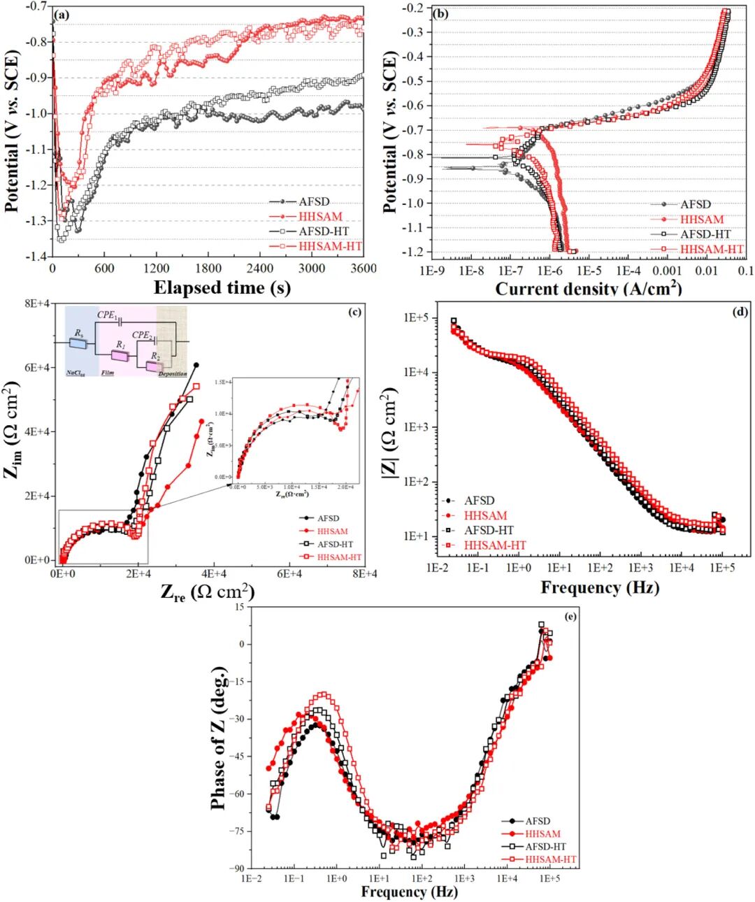 图11:各种沉积物的(a)Eocp vs. 浸泡时间,(b)PD曲线,(c)Nyquist和(d, e)Bode图。