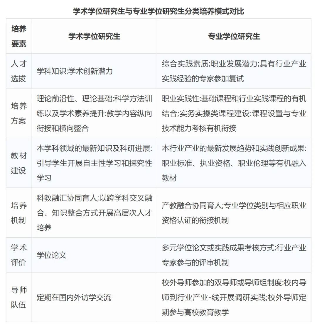 在这背后,其实是硕士研究生培养的“分层”——学术型人才“直博化”,应用型人才“专硕化”。 2023年,教育部印发《关于深入推进学术学位与专业学位研究生教育分类发展的意见》,提出“深入推进学术学位与专业学位研究生教育分类发展、融通创新”,“深入打造学术学位与专业学位研究生教育分类培养链条”。这一分类培养链条表现为:针对学术学位研究生,学术研究训练是培养链条的灵魂,强调学术创新潜力的提升;针对专业学位研究生,培养链条的逻辑起点是特定领域知识,目的是解决行业产业实践问题。
