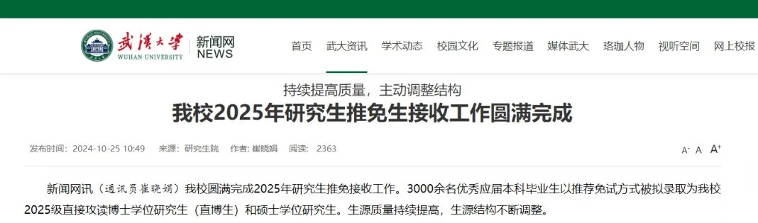 这透露出一个信息,保研该校的学生,要么选择专硕,要么选择直博或硕博连读。纯粹意义上的学硕,没了? 学硕,直博化! 当前,我国将学术型硕士定位为一种具有独立就业导向的学位,而非博士预备阶段。 以2023年为例,我国共招收博士生约13.5万人。其中,硕博连读占比约35%(部分“双一流”高校可达50%),本科直博占比约12.5%,普通招考(硕士毕业后考博)占比约52.5%。可见,硕博连读和本科直博已成为重要路径,尤其头部高校更倾向于贯通式培养。 浙江师范大学高质量教育发展研究院教授刘爱生提出:在新形势下,政府应在政策层面重构学术型硕士的定位,明确将学硕定位为“博士教育的过渡阶段”,而非具有独立就业导向的学位。 这说明,学硕的培养目标应倾向于培养“科研预备军”,走上硕博贯通的道路。 以武汉大学为例,2025年,武大扩大接收直博生规模,接收数相比2024年增幅超过50%。同样,复旦大学强基计划学生转段2025级拟录取研究生的直博生为64人,占比50%;而在2026级拟录取名单中,直博生的人数大幅提升,高达104人,占比上升至64.6%。