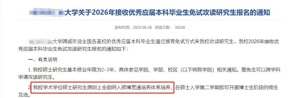 近日,某工信部直属高校发布《关于2026年接收优秀应届本科毕业生免试攻读研究生报名的通知》,明确提到:“全校学术学位硕士研究生原则上全部纳入硕博贯通培养体系培养,在硕士入学第二学期即可开展博士生阶段的师生互选;全校直博生及硕博连读生的基本修业年限均为5年。”
