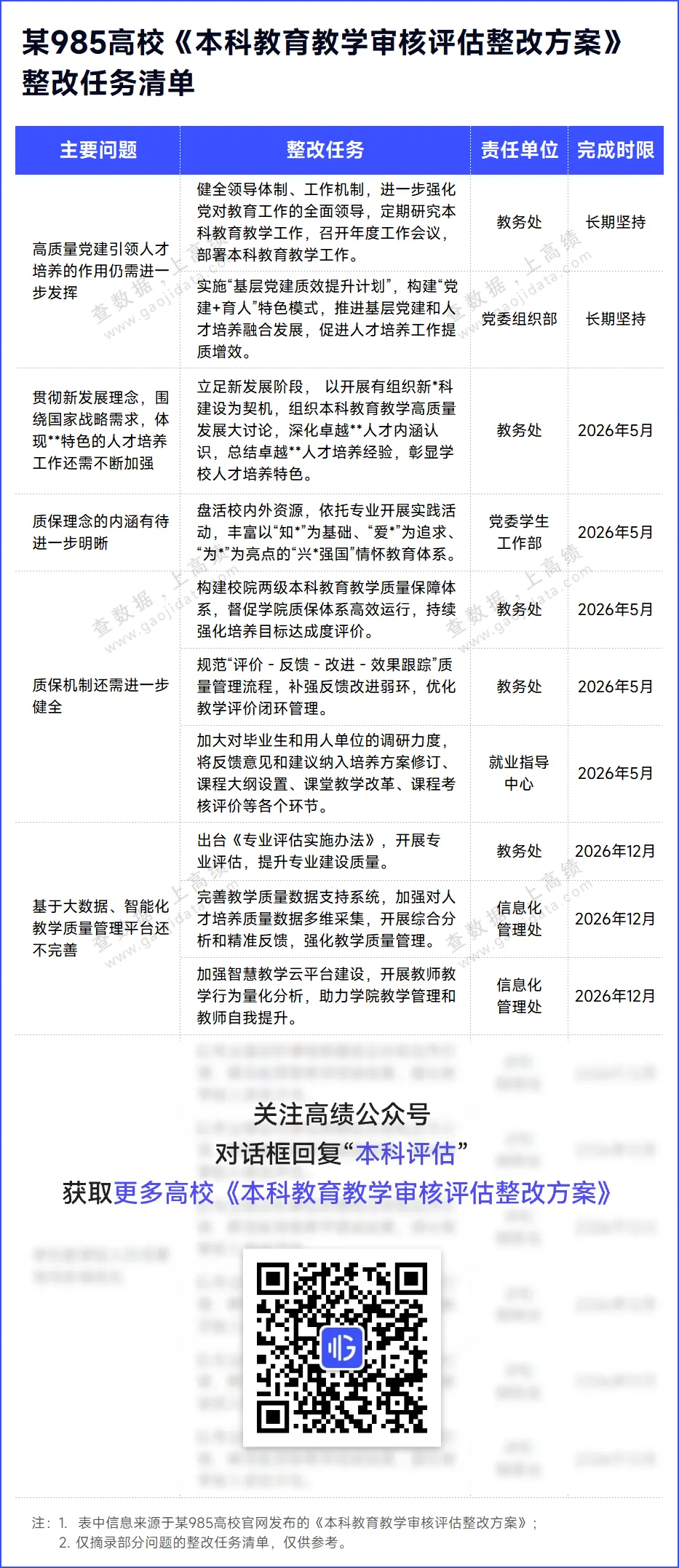 某985高校《本科教育教学审核评估整改方案》显示,整改进度跨越近两年,将在2027年3月完成最后的总结验收。方案针对存在的问题,列出了具体的整改任务清单和完成时限。