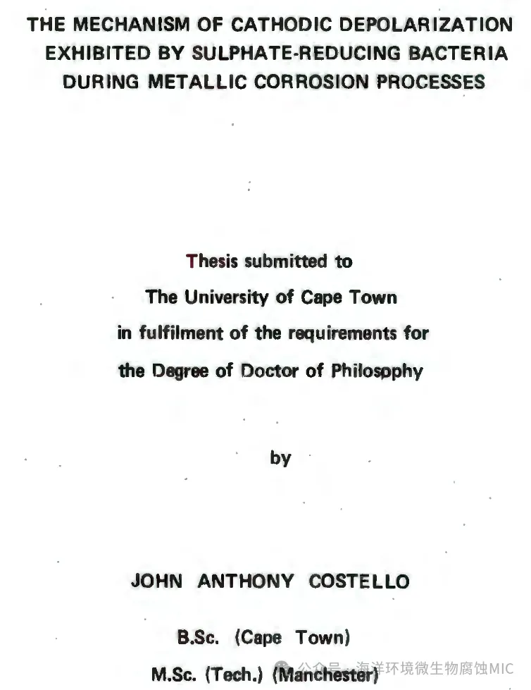 3. Costello.1974. The mechanism of cathodic depolarization exhibited by sulphate-reducing bacteria during metallic corrosion processes. S. Afr. J. Sci. 70, 202-204.