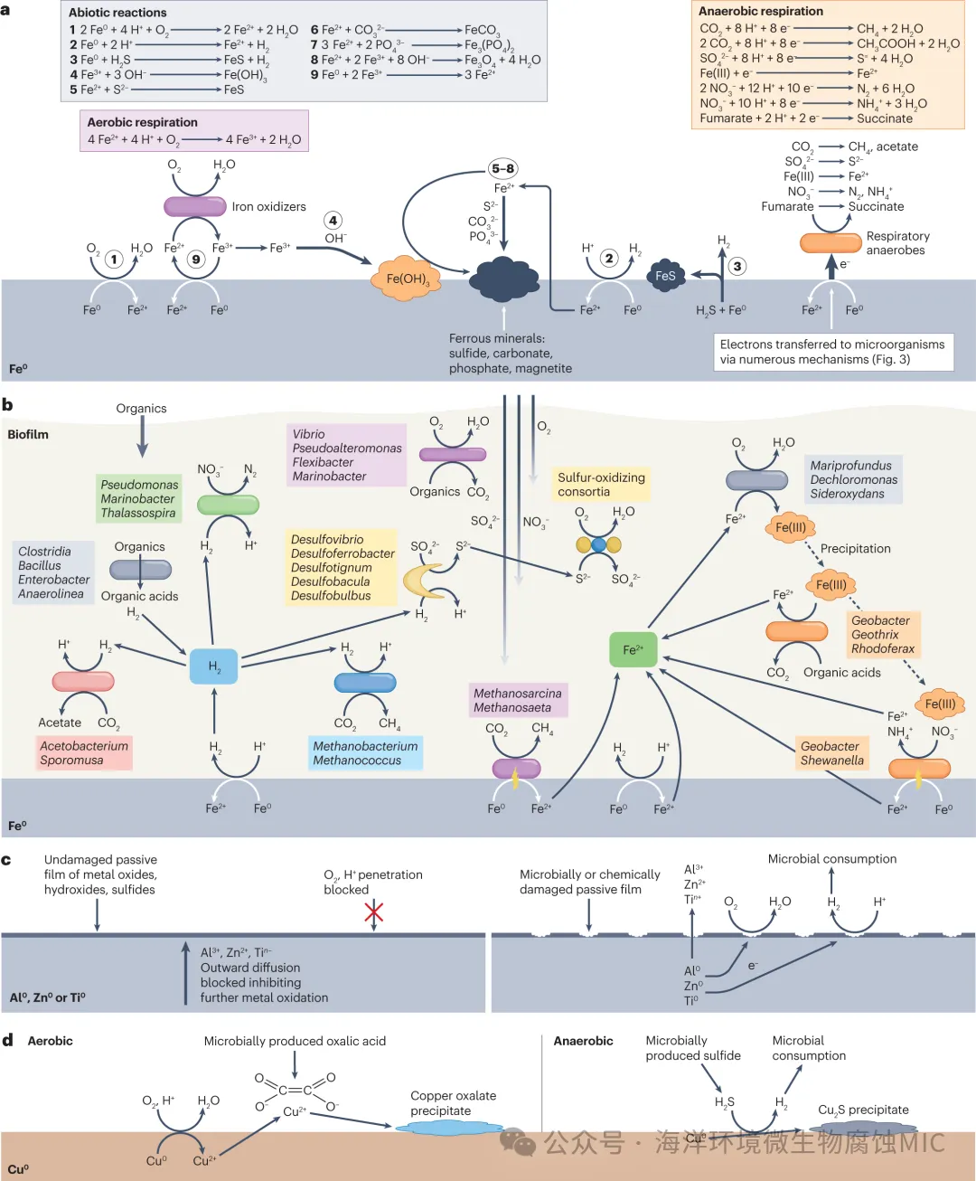 百年的微生物腐蚀研究随着新的表征技术手段的发展而迎来新的动向。各种各样的微生物,通常以生物膜的形式生长,与腐蚀有关。好氧微生物建立了促进金属腐蚀的条件,但大多数腐蚀被归因于厌氧菌。微生物产生的有机酸、硫化物和细胞外氢化酶可以加速金属铁(Fe0)的氧化,从而产生氢气(H2),呼吸厌氧菌也可以消耗H2作为电子供体。一些细菌和古菌直接接受Fe0的电子来支持厌氧呼吸,通常与c型细胞色素作为与金属的明显外表面电接触。功能遗传学研究开始更严格地定义腐蚀机制。组学研究揭示了哪些微生物与腐蚀有关,但需要新的策略来回收培养中的腐蚀性微生物,以评估腐蚀能力和机制。