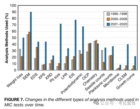MIC涉及微生物、材料(例如,金属)和介质/环境的相互作用。因此,往往推荐在实验室和现场测试中MIC分析和鉴定纳入这些三个不同学科的多条证据线(即分析方法)。图7提供了感兴趣期刊中MIC文章使用的分析方法类型概述。首先,几乎所有考察的个别分析技术使用随时间增长。第二,单篇论文平均分析方法数量从3.3(1990-1999)上升到3.8(2000-2009),然后到最新研究期的7.4。这意味着作者现在组合并报告大量更多分析技术,与过去相比。如今一些最常见测试方法包括扫描电子显微镜(SEM)、坑深分析、电化学阻抗谱(EIS)和动电位扫描。仅约三分之一论文提供浮游或固着微生物数量信息,没有发现作者在测试期间进行详细测试以检查任何微生物污染的案例。