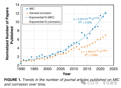 为获取微生物腐蚀发表的科学文章数量,进行Scopus搜索,使用文章摘要中的“microbially influenced corrosion”、“microbiologically influenced corrosion”、“biocorrosion”、“microbial corrosion”或“microbially induced corrosion”任何术语。附录中提供了这些类型搜索方法的一些局限性讨论。年度数据可用至2022年(含2022年)。为方便比较,类似搜索使用了一般术语“corrosion”。MIC发表文章绝对数量与一般腐蚀相比有相当差异,因此,为帮助可视化结果,将自1990年以来发表文章绝对数量vs.年份标准化,通过除以1990年准平均发表文章数量。年对年发表文章数量有合理波动。为考虑这一点,标准化值使用原始数据的指数拟合确定,然后计算对应1990年时期的值。