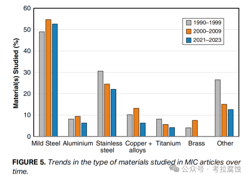 MIC文章中研究材料类型总结,随时间在目标期刊中显示在图5。最常见材料是碳/低碳钢变体,是最新研究期文章焦点略超过50%。不锈钢是下一个最常见调查材料,其次是铜/铜合金。近期合理趋势是合金组合的研究,如向碳或不锈钢添加铜,以及新型金属文章,如高熵合金。这些“新”材料的关键目的是找到保留目标应用所需关键属性(例如,机械强度)的合金,同时比应用使用的传统合金对MIC更不易感。