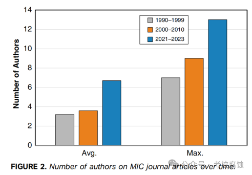 MIC期刊文章作者数量分析结果随时间显示在图2。这显示近期3年期平均和最大作者数量比1990-1999年翻倍。