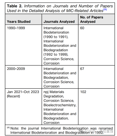 选择了五个科学期刊——Corrosion Science、npj Materials Degradation、Bioelectrochemistry、International Biodeterioration and Biodegradation和Corrosion,以分析MIC相关研究文章的详细内容。这些期刊基于它们历史和/或最近发表MIC文章以及在影响因子和分组主题类别中的相对高排名选择(见表1)。然后使用每个期刊网站上的搜索功能查找和下载该期刊包含“microbiologically influenced corrosion”或“microbial corrosion”或“microbially induced corrosion”的所有文章。然后手动扫描每篇文章以找到感兴趣的信息。每个期刊的期刊细节和研究文章数量提供在表2。总共考察了229篇文章,每个感兴趣时期至少60篇文章。