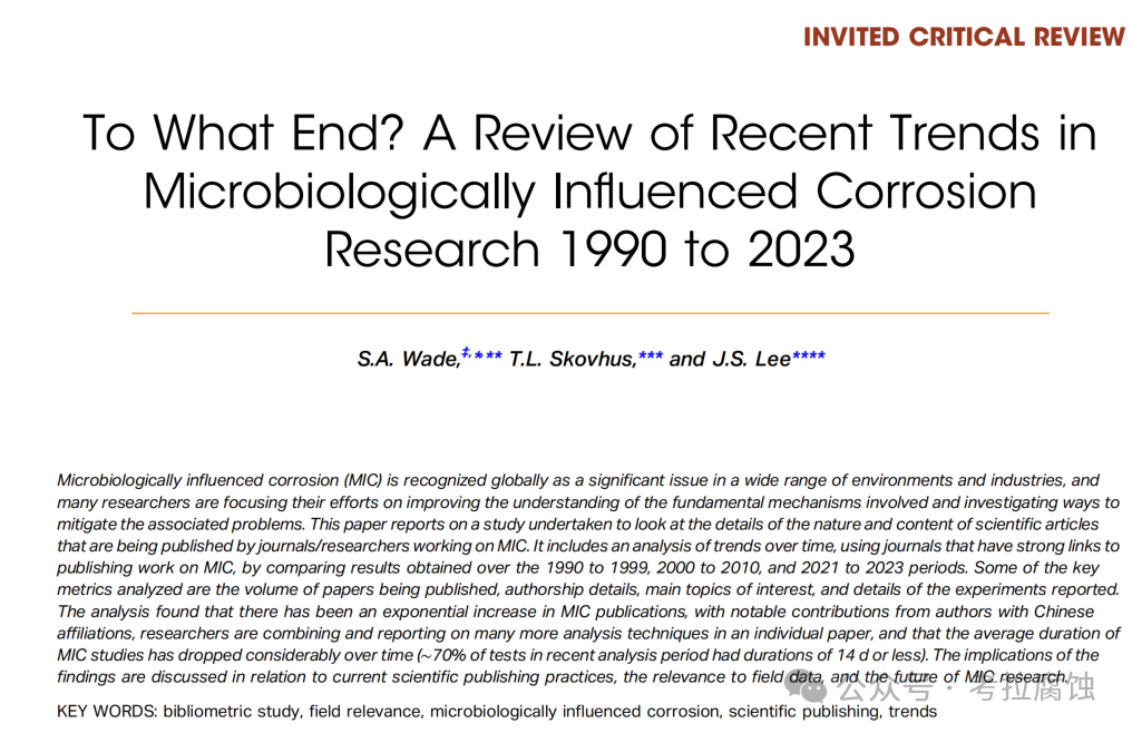 这篇评论文章标题为《To What End? A Review of Recent Trends in Microbiologically Influenced Corrosion Research 1990 to 2023》(路在何方?微生物腐蚀研究1990至2023年近期趋势回顾),由S.A. Wade、T.L. Skovhus和J.S. Lee三位作者撰写,发表于《Corrosion》期刊2025年7月卷。