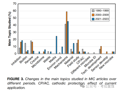 每个研究文章研究的主要方向主题见图3。基础MIC机制研究在每个研究时期高排名并不令人惊讶,因为这种研究往往落入许多高排名期刊倾向要求的高度“新颖”范围/要求。沿着相同线路,报告现场研究的文章往往被此类期刊视为较少“新颖”,这可能解释这些特定期刊发表论文的减少。这些期刊中相关MIC综述数量也减少,可能出于类似原因。除了分配为“基础机制”的工作,近期趋势是出版与测试介质效应、环境条件和新/新型材料相关的工作。
