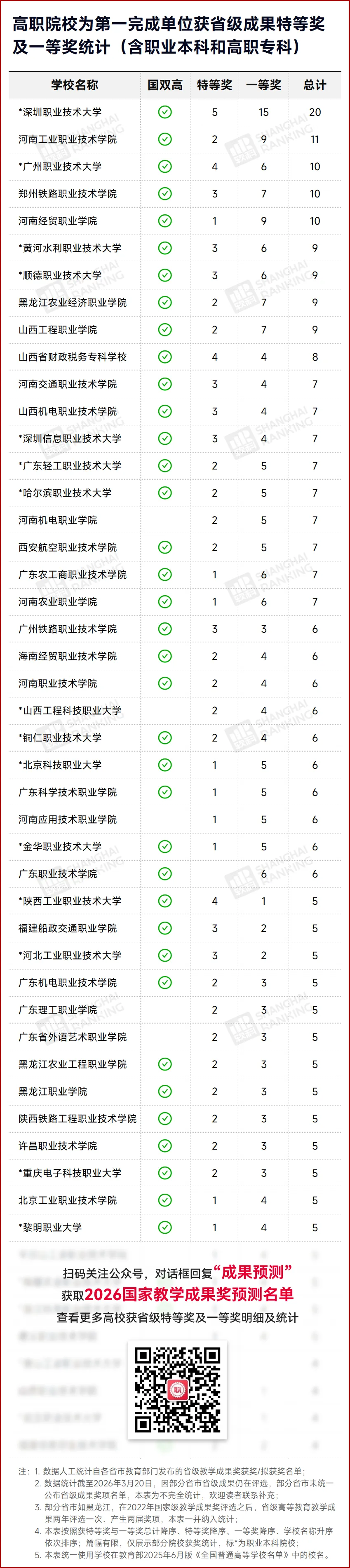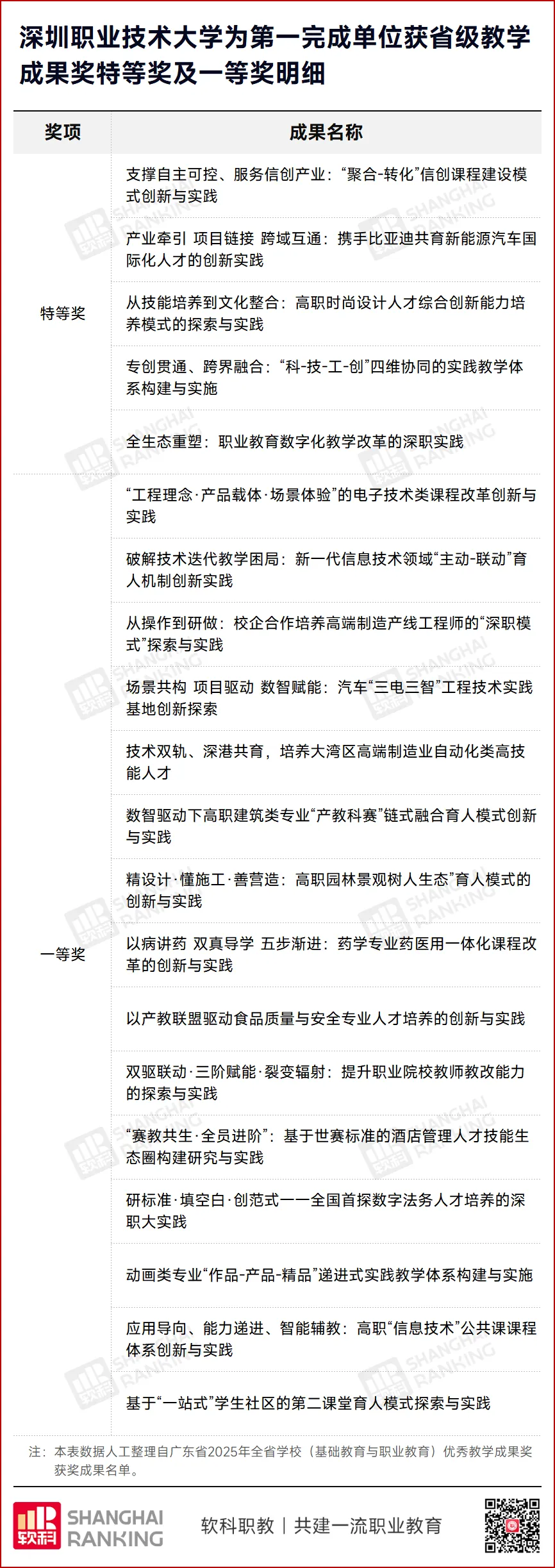 职业教育类型成果方面,以高职院校获得特等奖及一等奖总数最多的深圳职业技术大学为例,学校获得2025年度广东省级教学成果特等奖5项、一等奖15项,均为职业教育(高职)类型成果。