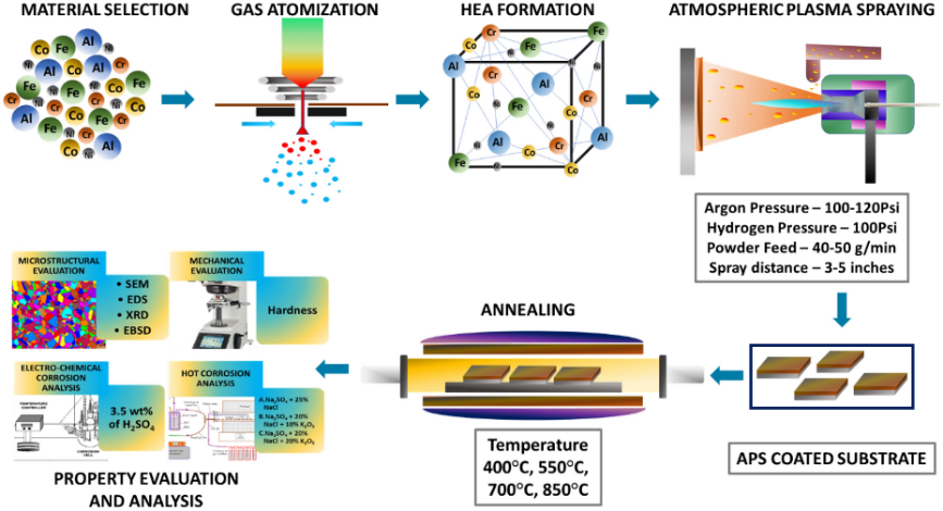 工业应用中偶然的需求推动了对先进材料的探索,并且持续研究以开发解决工业性能相关问题的新型材料和加工技术是至关重要的。自合金的出现以来,一直是通过将两种或多种元素结合在一起改善基材的性能1。 目前材料科学研究的趋势表明,合金化能提供比基材更优越的特性。材料科学应用广泛,这些为满足需求的探索促成了高熵合金(HEA)的发展。尽管HEA具有复杂的性质,但它也提供了更好的性能。HEA是由五种或更多元素按照等原子或近等原子比例混合而成。尽管HEA形成合金的系统复杂且存在生成金属间化合物的高可能性,但由于其高混合熵,HEA的体系仍表现出单相固溶体的特性2,3。 通过对HEA成分的定制化以最佳地满足需求是高熵合金涂层的优势4,5。Chiu等通过气体雾化法制备了Al0.5CoCrFeNi2 HEA,并研究了其微观结构和机械性能。结果表明其形成了具有球状颗粒的FCC相,并通过EDS确认了元素组成。此外,HEA在热处理后在高温下具有高稳定性,并表现出高硬度6。因此,HEA可以作为增强材料,通过改善基材的特性以实现高效性能7,8。且HEA作为增强材料的应用可以扩展到表面改性和涂层。在各种基于热的涂层工艺中,大气等离子喷涂(APS)是一种最有应用前景的涂层工艺9-11。 Jiang等人使用APS技术以NiCrAlY作为结合层的铁基316不锈钢上研究了氧化铝陶瓷涂层的机械性能和耐磨性能。通过优化喷涂功率至75 kW,孔隙率降低了1.67%12,并显著提高了硬度和耐磨性。Yang等人研究了通过APS在不锈钢基材上制造共晶氧化铝-钇铝石榴石陶瓷复合涂层,并在1200℃下进行了24小时热处理。结果表明硬度提高了72%,并且在热导率方面表现出显著稳定性13。 An等人对于采用APS对1Cr18Ni9Ti不锈钢表面附加纳米和微米Al2O3涂层的力学性能和磨损性能进行了研究。与微尺寸Al2O3相比,纳米尺寸Al2O3涂层样品的硬度增加了20%,且孔隙率显著降低。磨损分析表明,纳米级Al2O3具有显著的耐磨性,而其磨损程度明显较小14。 Patel等人分析了在Q235钢上开发的CrMnFeCoNi HEA涂层的微观结构和磨损性能。涂层呈现FCC相,厚度为380µm。随后的退火使涂层厚度增加了20µm,使其摩擦学性能得到了改善15。 在喷涂过程中可能产生残余应力,为此需要一种方法来来克服这一问题。其中热处理是一种有效的减少残余应力的方法16。其中,退火过程是改变微观结构、提高力学性能和功能性的关键。Girolamo等人使用ZrO2-8 wt.%Y2O3为原料在不锈钢衬底上进行等离子喷涂17。喷涂后的基板在1315℃下退火10和50小时。在单斜相二氧化锆中,老化过程逐渐增加13.8%,热膨胀明显增加18。 化工厂和核电厂中使用的钢材通常都暴露在恶劣的环境中且受到严重的腐蚀。在某些情况下,那些钢铁承载的液体温度可能远高于室温。这就需要对钢材分别在室温和高温分析其腐蚀行为。为此,在锅炉管道表面通过等离子喷涂了一种氧化铝和碳纳米管的混合物。并将其在900℃下进行50个周期,每个周期为1小时的热腐蚀行为分析。由于在表面上形成了保护层,与未涂层样品相比,经过喷涂的样品的重量增加明显较低19。 在700℃条件下,用等离子喷涂过的合金钢在含有氢氧化钠和氧化钒的混合物进行了50个周期,每个周期为1小时的热腐蚀行为分析。与未涂覆的样品相比,由于经过喷涂的样品有着更少的孔隙和空隙,涂覆样品的重量增加与循环次数的比值更低20。用氧化铝涂层喷涂的锅炉钢在含有硫酸钠和五氧化二钒的盐混合物中进行了850℃下25个周期 每个周期1小时的热腐蚀分析。结果显示,涂层样品在高温下具有更好的耐腐蚀性能21。用氧化铝和氧化钛对锅炉钢进行喷涂,然后将其浸泡在含有硫酸钠和五氧化二钒的盐混合物中,在900℃下进行50小时以研究其热腐蚀行为。结果表明,二氧化钛涂层钢的质量损失最小,显示出其优异的热腐蚀耐受性22。 迄今为止,已经报道的工作主要集中在等离子喷涂钢的涂层表征上,对高熵合金(HEA)涂层的研究很少,并且几乎没有关于经过退火和高温腐蚀行为研究的报道。 因此,本研究提出通过APS工艺在SS316L钢基材上涂覆合成的AlCoCrFeNi高熵合金,然后进行退火处理,并通过对微观结构研究和机械测试及腐蚀分析,将所得结果与未涂层和预退火样品进行比较,来评估退火的影响。