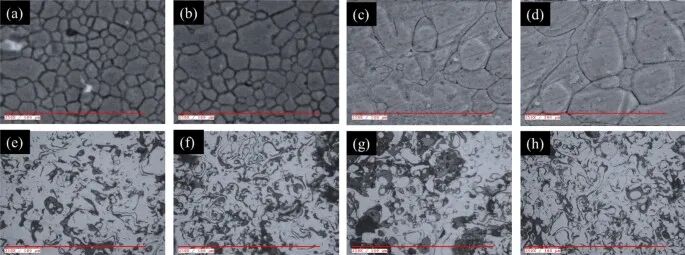 图3:(a)涂层截面的扫描电镜图(b)涂层表面的能谱元素像分析图(c)涂层的X射线衍射谱图 图4展示了未喷涂的基材以及经APS喷涂AlCoCrFeNi HEA涂层的基材在不同温度退火后的光学显微照片。其中图4a-d展示了基材在不同退火温度下的光学显微照片。图4e-h展示了经APS喷涂AlCoCrFeNi HEA涂层的基材在不同温度退火后的光学显微照片。其中在图4a中可以观察到在400℃条件下退火会产生大量的空隙,从而导致晶粒结构展现出分散的片状结构。 在图4b中可以看出进一步将退火温度提高到550℃后空隙量明显降低,晶粒结构也因此更加紧密。这表明晶粒结构的位错减少且样品内部应力的释放。从图4c中可以看出将退火温度进一步升高超过550℃,晶粒微观结构没有变得更加紧密反而变得更加分散,这是由于退火温度过高导致晶界变化剧烈,重结晶减少导致的。且从图3d中看到当退火温度进一步升高至850℃时,基材表面的梯度微观结构也发生了显著的变化。 而从图4e可以看到经过喷涂的样品在400℃条件下退火,并没有显著的晶粒生长和深色相的出现,说明涂层表面存在较多的空隙且有氧化物生成。进一步从图4f可以看出,将退火温度进一步提高到550℃会使材料表面的晶界更加细化,晶粒结构出现且变得更加致密且稳定。在图4g和4h中将退火温度进一步提升至700℃及850℃,都表现出晶粒尺寸显著增加,涂层表面的孔隙也进一步地减少的特点。这是因为在高温退火下内应力的得到释放,使得暗相扩散导致的。