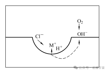 已形成的蚀孔随着腐蚀的继续进行。小孔内积累了过量的正电荷,引起外部Cl-的迁入以保持电中性,继之孔内氯化物浓度增高。由于氯化物水解使孔内溶液酸化,又进一步加速孔内阳极的溶解。这种自催化作用的结果,使蚀孔不断地向深处发展,如下图所示: