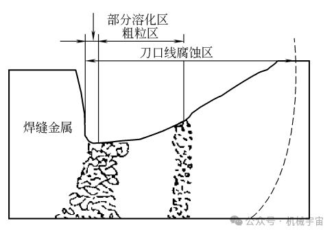 ③熔合线处的刀口腐蚀,一般发生在用Nb及Ti稳定的不锈钢(347及321)。刀口腐蚀大多发生在氧化性介质中。刀口腐蚀如下图所示: