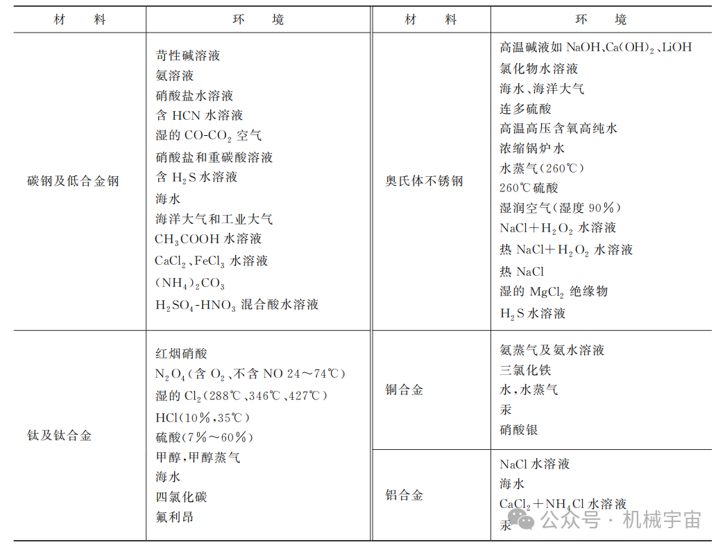 并不是任何的金属与介质的共同作用都引起应力腐蚀破裂。其中金属材料只有在某些特定的腐蚀环境中,才发生应力腐蚀破裂。以下列出了容易引起应力腐蚀开裂的管道金属材料和腐蚀环境的组合: