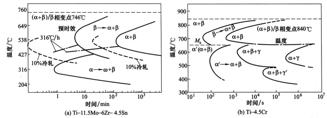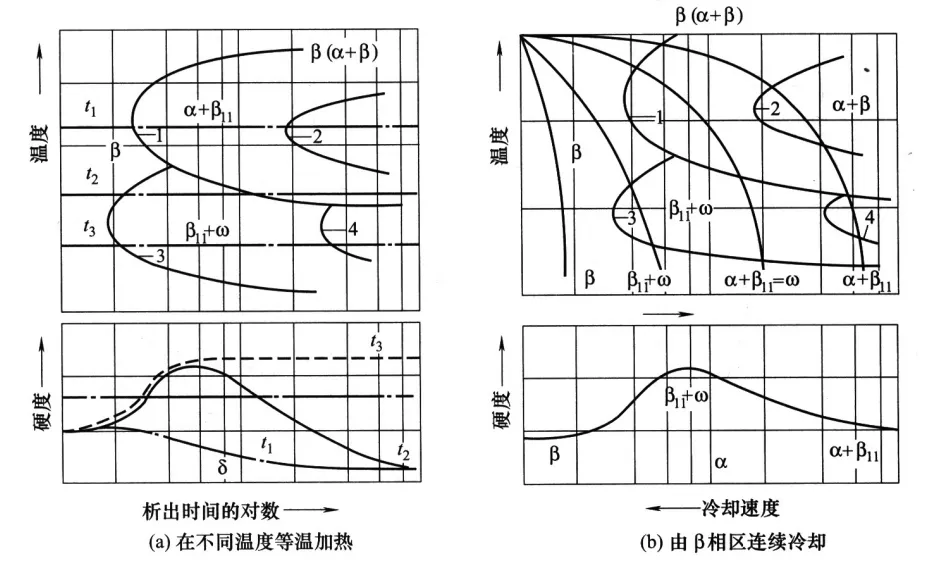 加热到一定温度进行人工时效时,淬火得到亚稳相按一定方式分解而产生强化效应,其强化效果取决于亚稳相的类型、数量、成分及时效析出相的弥散度,分解为弥散的α相或β相,可使合金得到显著强化。对于成分一定的钛合金,根据时效过程的温度-时间-转变量关系的TTT图(等温转变动力学曲线)可以确定合金的时效工艺。图37a为Ti-11.5Mo-6Zr-4.5Sn合金的TTT图,图37b为Ti-4.5Cr合金的TTT图,其中Y相为TiCr2,合金成分不同,C曲线的形状和位置不同,相应时效工艺发生变化。