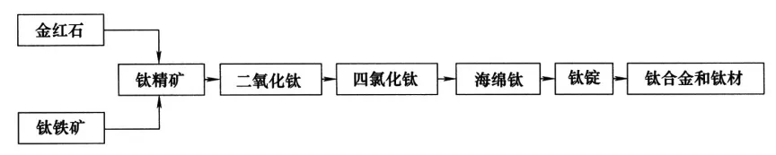 图5为钛合金及钛材生产流程,在获得钛材之前,要对金红石、钛铁矿等原始矿产进行选矿,获得品位更高的精矿,对精矿进行加工提纯获取高纯度的Ti02,再对其进行氧化、还原得到TiCl4,制取中间产品海绵钛,对海绵钛进行破碎和分级,得到商业纯钛 (CP钛)和钛合金熔炼的产品,通过压力加工或粉末冶金方法获得钛合金材料或制品。