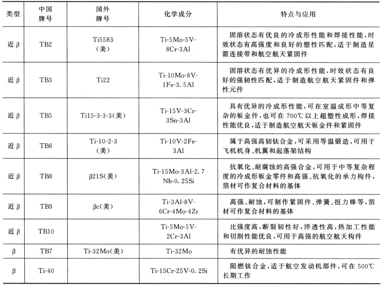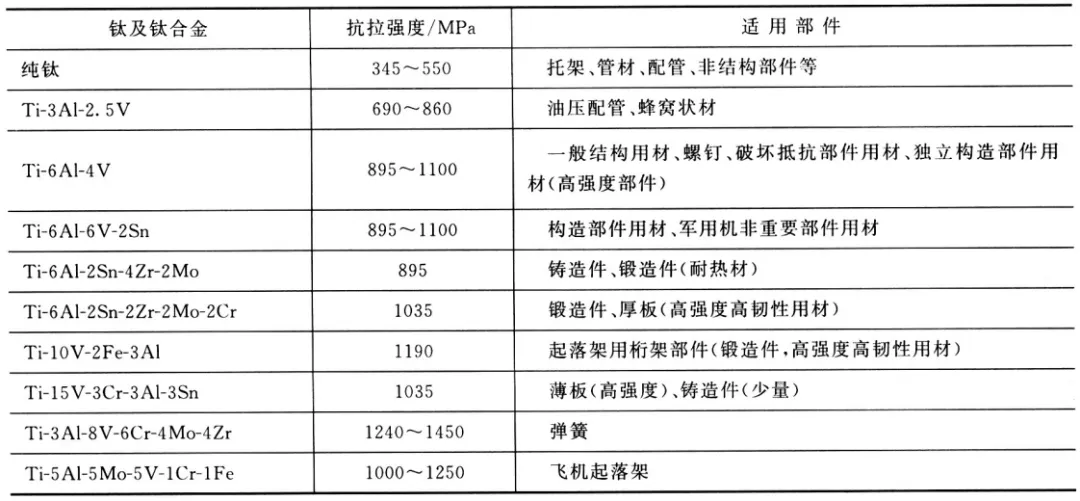 工业纯钛和Ti-6AI-4V,Ti-5AI-2.5Sn,Ti-6AI-4V ELI,Ti-5AI-2.5SnELI,Ti-7A1-4Mo,Ti-3A1-2.5V,Ti-15V-3Cr-3Sn-3A1,Ti-13V-11Cr-3A1,Ti/B-Al复合材料等在航天 领域得到较多应用。