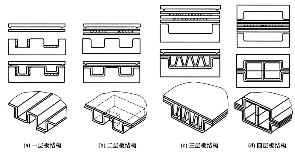 图31为SPF/DB零件的基本结构形式及成形示意图,钛合金的三层板结构件和四层板结构件广泛应用于航空航天领域,相比于传统的铆接或胶接,其整体性和连接强度高很多。