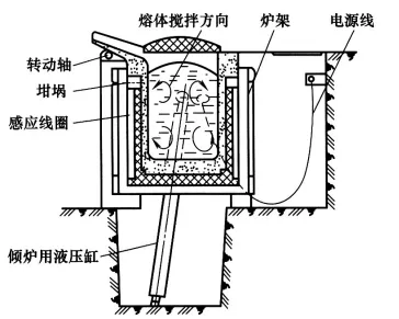 图14为感应熔炼炉示意图,利用交变磁场力使金属熔融悬浮且不与坩埚接触,可直接使用废料和海绵钛作为熔炼原料,搅拌能力强、合金化容易,成分和温度均匀,但是设备费用高,生产效率低。容易产生气体是钛合金铸造的主要困难,通常要在浇注系统中设置合理的排气道,保证铸型有良好的透气性,通过铸型真空除气、离心浇注或压力铸造等方法降低气体含量。