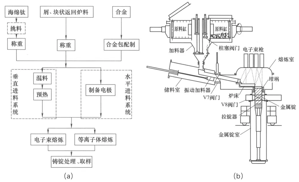 图11 a冷床炉熔炼的工艺流程;b电子束冷床炉结构示意图