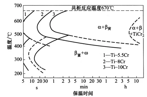密排六方结构的α相在体心立方结构的β相基体中形核比较困难,亚稳定β的分解要经过一些中间分解过程,生成过渡相再转变为平衡的α相,至于生成何种过渡相,取决于加热温度和合金成分。图36为不同成分的Ti-Cr合金的等温转变曲线,含Cr量越高,过冷β越稳定,分解开始及终了所需的时间越长,C曲线越往右移.
