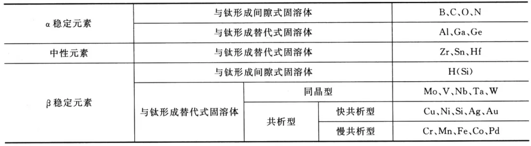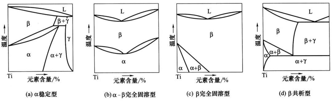 Ti与元素周期表中大多数元素都能发生反应,根据其与钛的相互作用 ,可将元素周期表中的元素分为四类:第一类是卤族元素和氧族元素,与钛生成离子化合物 ;第二类是过渡元素、氢、铍、硼族元素、碳族元素、氮族元素,与钛生成金属间化合物和有限固溶体;第三类是锆、铪、钒族元素、铬族元素、钪,与钛生成无限固溶体;第四类是惰性气体元素、碱金属元素、碱土金属元素、稀土元素(钪除外)、婀、牡等元素,不与钛发生反应或基本不发生反应。有70多种元素能与钛形成二元合金,分为αβ稳定型、αβ-完全固溶型、β完全固溶型、β共析型四种类型。图2为四种类型的二元钛合金相图。