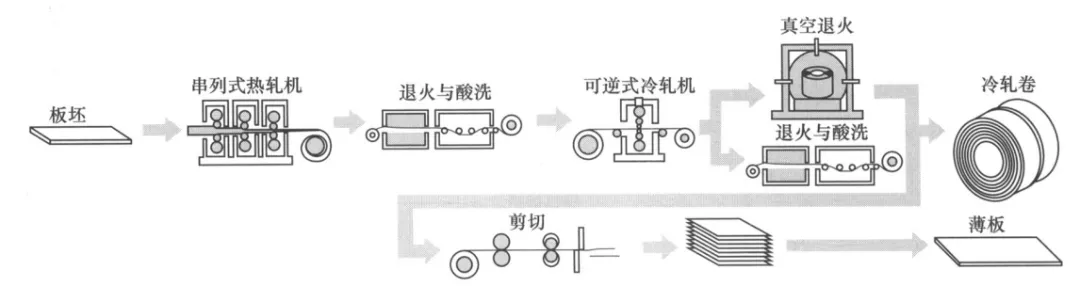 轧制可用来生产钛及钛合金板、带、箔、棒、管、型材,特别是可以生产薄壁、变断面型材,生产的钛材表面质量好、内部质量稳定。钛的轧制有热轧、温轧和冷轧,2-5mm 厚的板材可采用温轧,更薄尺寸的可采用冷轧,两次退火间的冷轧变形量一般为15%-60%。