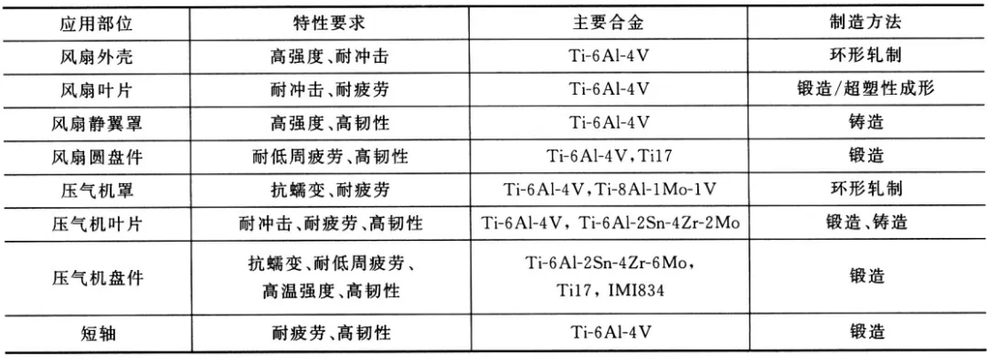 表20 飞机发动机应用钛合金的部位及合金制造方法