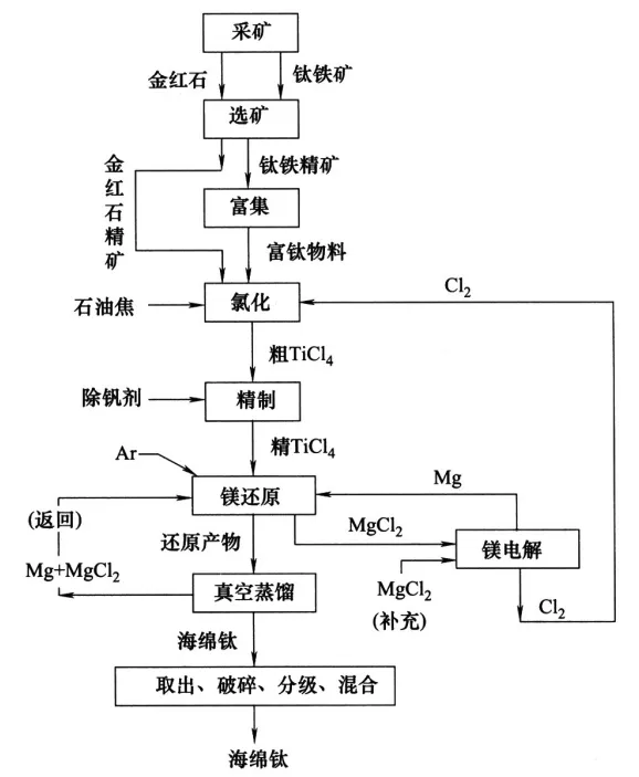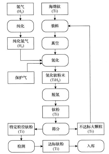 目前世界上常见的钛粉生产方法有:氢化脱氢法、导电体介入反应法、阿姆斯特朗工艺、预成型还原法、高能球磨法、金属氢化物还原法、连续熔盐流法、 等离子氢还原法、气相还原法、气雾化法等。其中,氢化脱氢法具有操作简单、 成本低等特点,是钛粉生产的最常用方法。氢化脱氢法是将海绵钛吸氢后产生的脆性氢化钛,通过机械法粉碎,在真空高温条件下脱氢制取纯钛粉的一种工艺。氢化脱氢工艺流程如图6所示。目前广泛应用的工业制钛方法为镁还原法,图7为镁还原法制取海绵钛的流程 ,以精四氯化钛为原料 ,以氩气保护下的金属镁为还原剂。