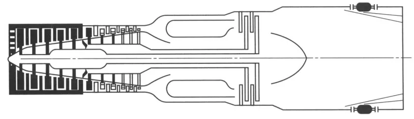 作为飞机的心脏,发动机推重比越大越好,但对材料的要求就越高。图41为喷气发动机的用钛部位示意图,其中黑色区域代表钛合金,主要用于压气机风扇盘、风扇叶片、中/高压压气机盘、动叶片、静叶片、涵道等部件。因有较好的高温性能,钛合金成为发动机压气机叶片和盘件用材的主要选择,高温钛合金的研制一直在先进航空发动机的需求牵引下进行。