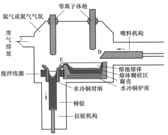 除热源不同外,等离子体冷床炉的结构与电子束冷床炉基本相同,如图12所示, 包括热源系统、冷炉床、结晶器 、喂料机构、真空系统、水冷系统、控制系统、充气系统等。