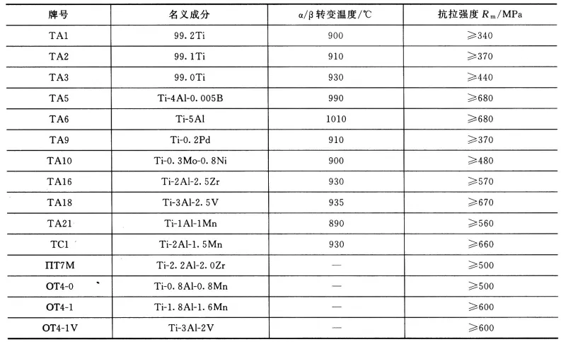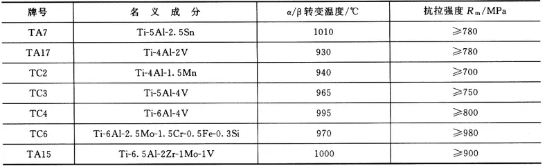利用钛的同素异构特点,在钛合金中加入不同的相稳定元素,使相变温度和相成分含量呈现出差异。根据室温条件下获得不同的基体组织,可将钛合金分为以下三大类:α钛合金、β钛合金和a+β钛合金,其牌号分别用TA,TB和TC表 示。其常见分类如表2所示。