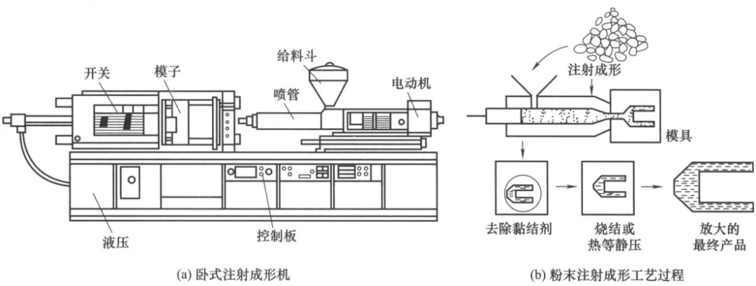 图25 注射成形机及粉末注射成形工艺过程示意图