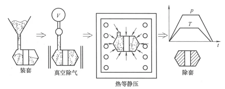 致密化是改善粉末冶金制品质量的关键,航空应用的钛合金粉末冶金结构零件,必须要全致密化,而全致密化对于高熔点、高活性的钛合金来说,难度很大。为了提高粉末冶金钛合金的抗拉强度和疲劳强度,一般采用致密化后的后续加工或热处理、化学热处理。常用的后续热加工手段有热压、热等静压、热挤和热锻。图26为热等静压工艺过程示意图。