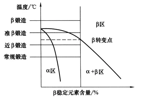 锻压包括锻造和冲压。冲压可加工壁薄、形状复杂的零件,可以得到强度大、刚性高、重量轻的零件,加工件质量稳定、一致性好、互换性好、材料利用率高、生产率高。钛合金的锻造可分为α+β锻造、β锻造、近β锻造及准β锻造,图15为钛合金不同锻造工艺及温度示意图,不同锻造工艺可以得到不同的锻造组织。